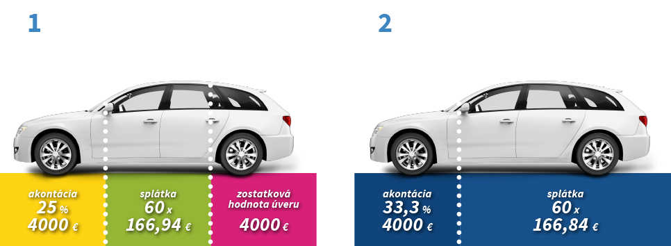Modelové jazdené vozidlo s obsahom motoru 1,6 za 12 000 Eur, výška úveru 8 000 Eur, akontácia 4 000 Eur, zostatková cena 0 Eur, doba splácania 60 mesiacov, mesačná splátka 164,13 Eur, celkové náklady spotrebiteľského úveru 10 010,40 Eur, úroková miera 8,50 %, RPMN 9,83 %.